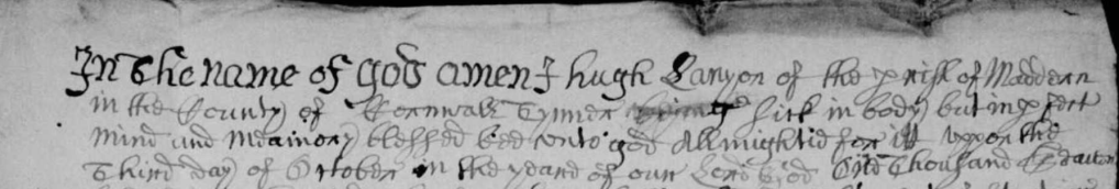 The first confirmed ‘tynner’ in the family is Hugh Lanyon 1648-1709. Hugh was born in Madron, the son of William Lanyon and Jane. He married Mary Tonkin and is described as a ‘merchant of Paul.’ His will survives and it is that document which describes him as a ‘tynner’.
