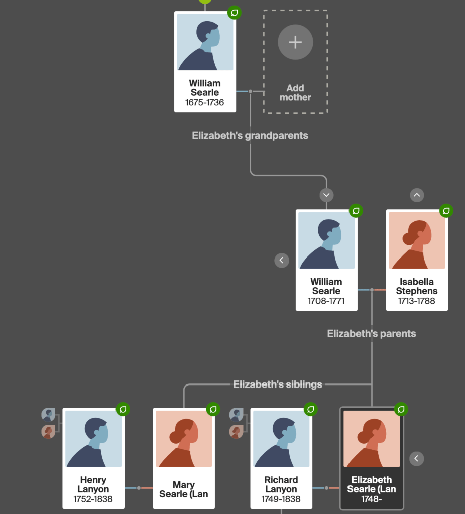 Elizabeth and Mary Searle were the children of William Searle and Isabella Stephens. William Searle jr was the son of William Searle 1675-1736.