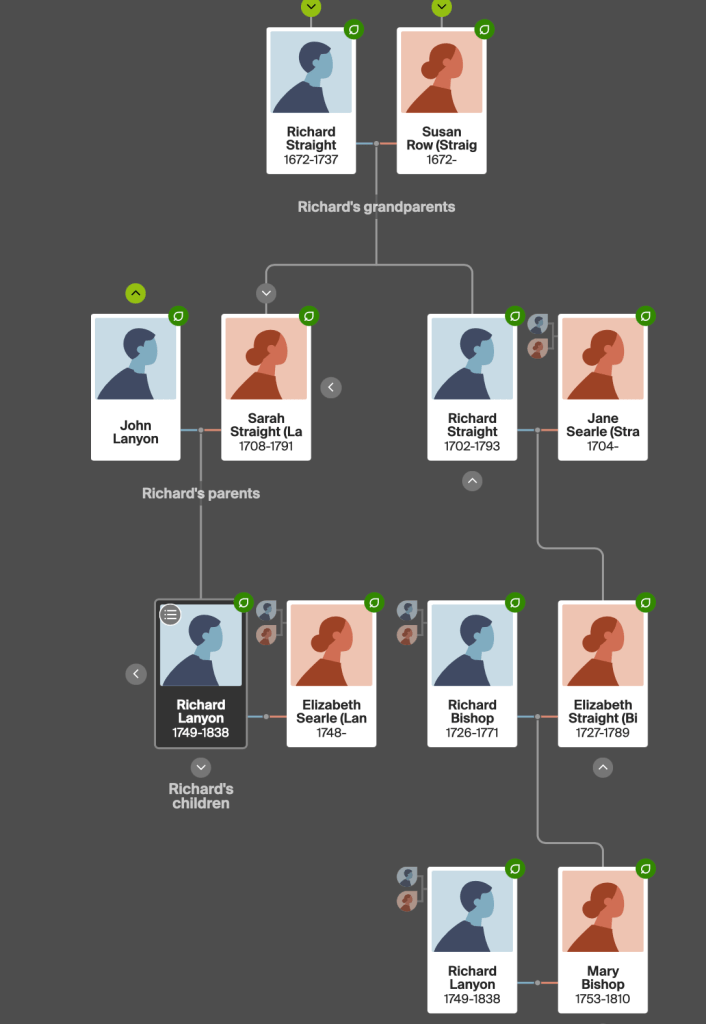 But it gets even more complicated because Mary Bishop’s grandmother is Jane Searle (Straight) 1704- and Jane was the sister to Richard Lanyon’s father-in-law, William Searle 1708-. So Mary Bishop’s granny was Elizabeth Searle (Lanyon)’s aunt!