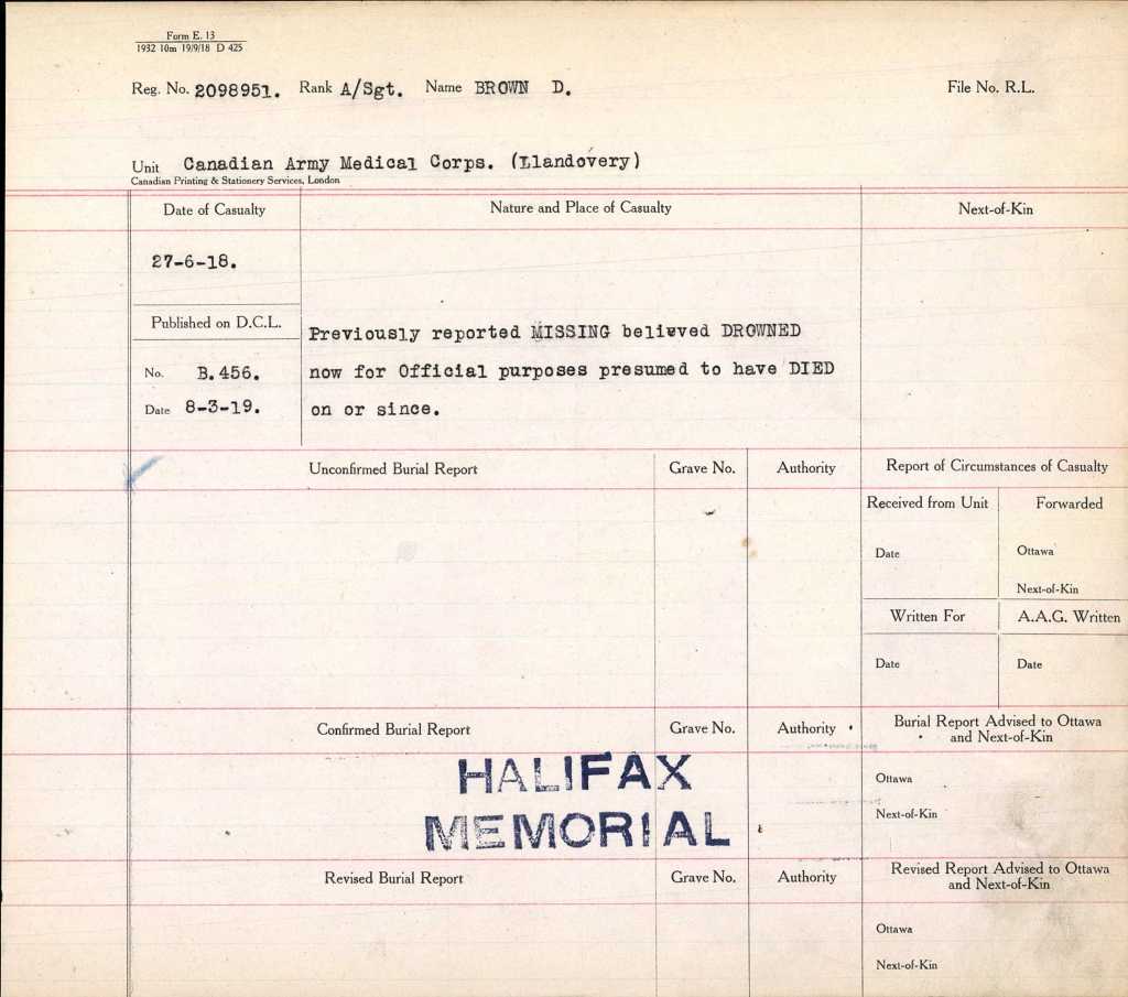 Susan Beatrice 1871- 1949 in 1912 she was a military nursing sister. In 1916 she married Daniel Brown in Ontario. He was a widower, an acting sergeant in the Canadian Medical Corps. He died in Jun 1918, he was missing believed drowned. By 1939 she was living with her sister Alice in Newquay and she died in 1949 at Holloway Sanatorium.