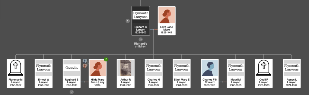 Edward’s eldest son Edward James Lanyon was an inland revenue officer, he married twice, first to Jane Brown who died before 1867 and second to Elizabeth Parkin. There were three children from the first marriage:-