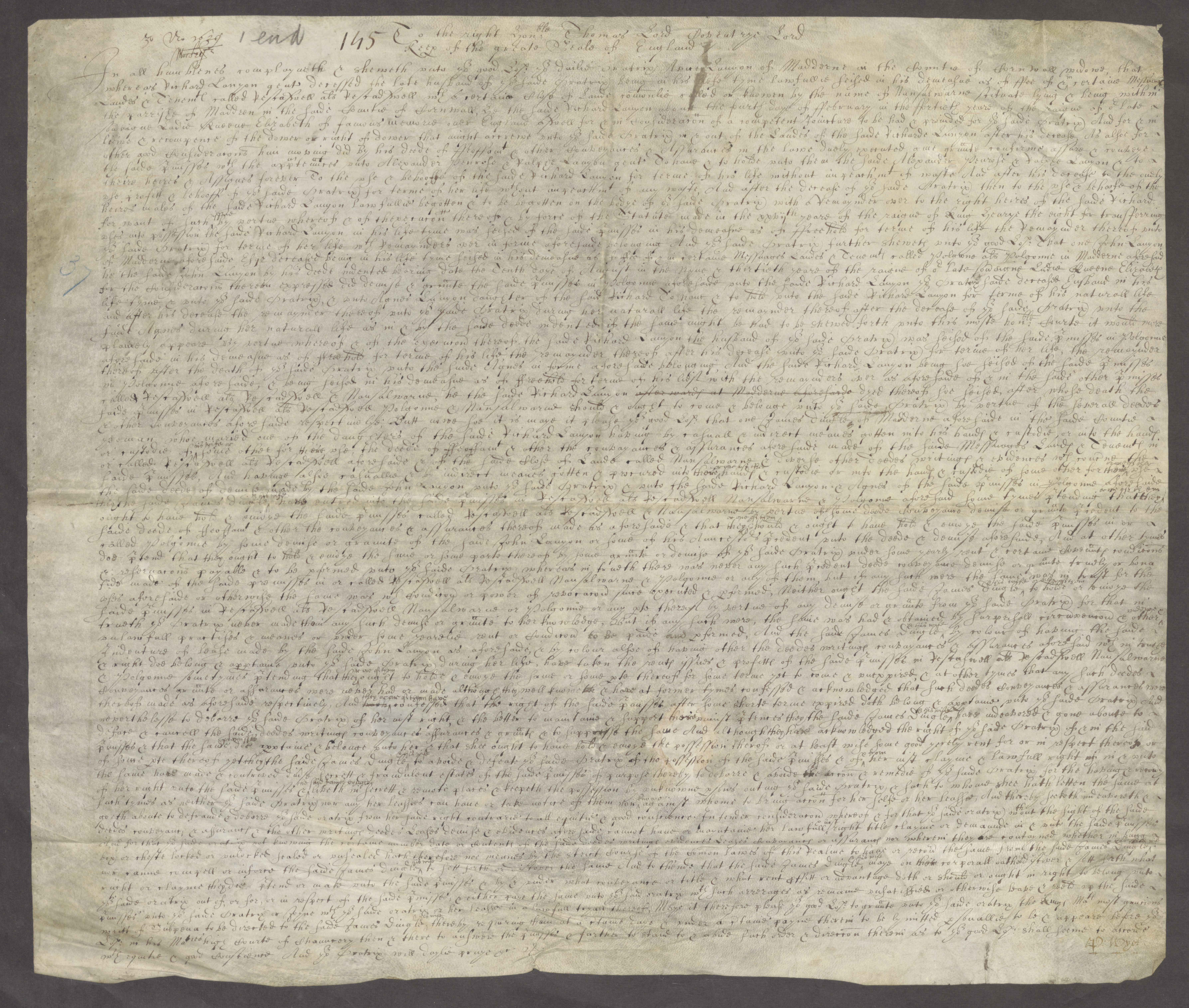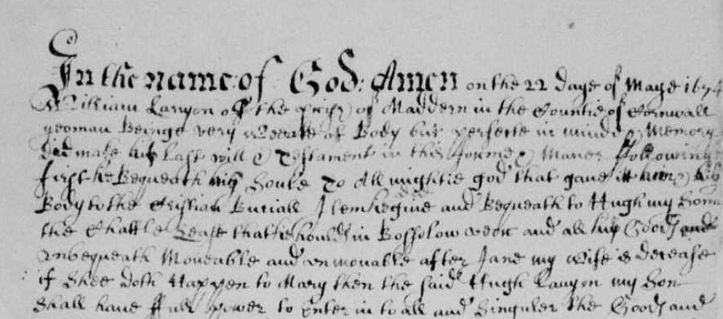 “In the name of God Amen On the 22 Daye of May 1674 William Lanyon of the parish of Maddern in the Countie of Cornwall yeoman Beinge very weake of Body but perfect in minde & memory Did make his Last will & Testament in this forme & maner following First he Bequeath his Soule To Allmightie God that gave it him & his Body to the Christian Buriall Item doe give and Bequeath to Hugh my Sonne the Chattle Lease that is house in Bossolow Veor and all his Goods un bequeath Moveable and unmoveable after Jane my wife is decease if shee doth happen to mary then the said Hugh Lanyon my Son shall have Full power to enter in to all and Singular the Goods and Chattles and to Turne her Away without Nothinge Item I give and bequeath to Thomas my Second Son one little Chattelle that I have in ?.. in Reversion of one life in possession and out of the Said Chattle the Said Thomas my Son is to paye Fortie Shillings and five pounds more I Doe give and Bequeath to William my Third Son to be paid at the End of Six Mounthes after my wife Jane is decease Item I give and Bequeath to Jane my Daughter Ten pounds to be paid att the end of nine mounthes after my wife is decease Item I give and Bequeath to Mary the Daughter of Elcana Lanyon one ewe Item I give and Bequeath to Thomas Lanyon my Son one ewe and the two Sonnes of Thomas Tonkinge Each of them one ewe Item I give and Bequeath to Margarett the wife of Thomas Tonkinge one ewe Item I give and Bequeath to Mary the wife of Edward Plomrose 12s and the residue of my Goods Moveable and unmoveable I give & Bequeath to Jane my wife during her life Time provided that shee doe not Marry whome I doe appoint Ordaine and make my Full & whole Executor, to Fullfill this my Last will and Testament”