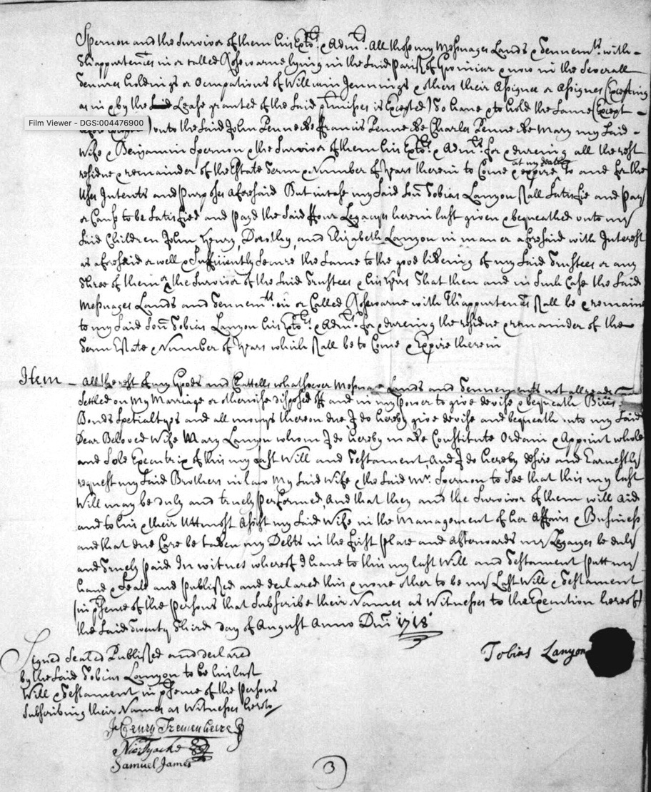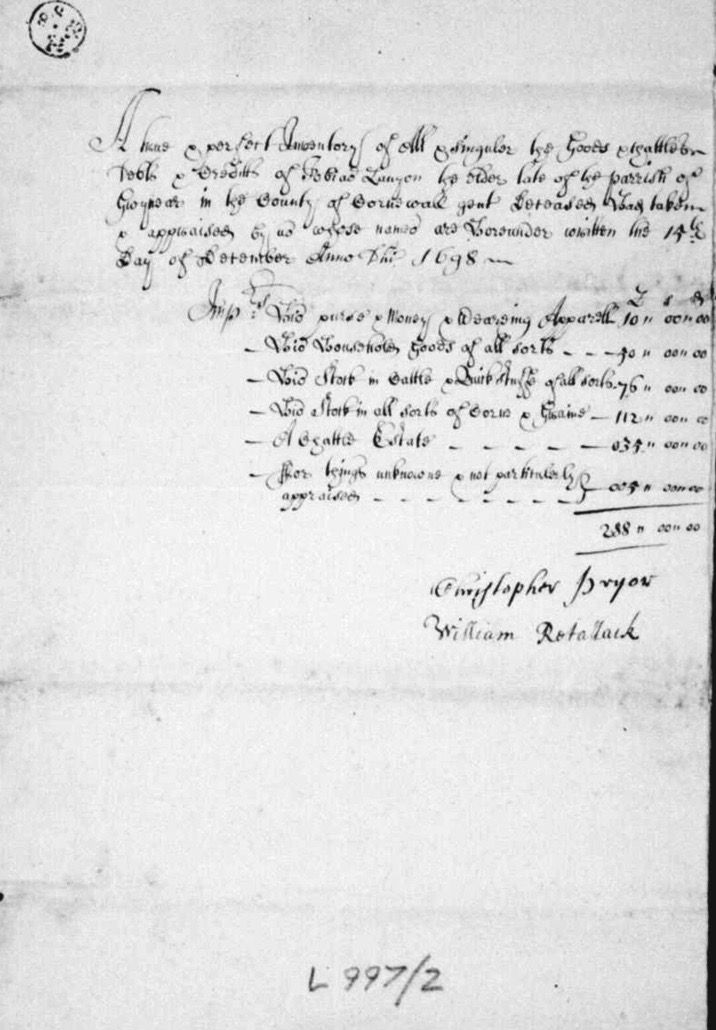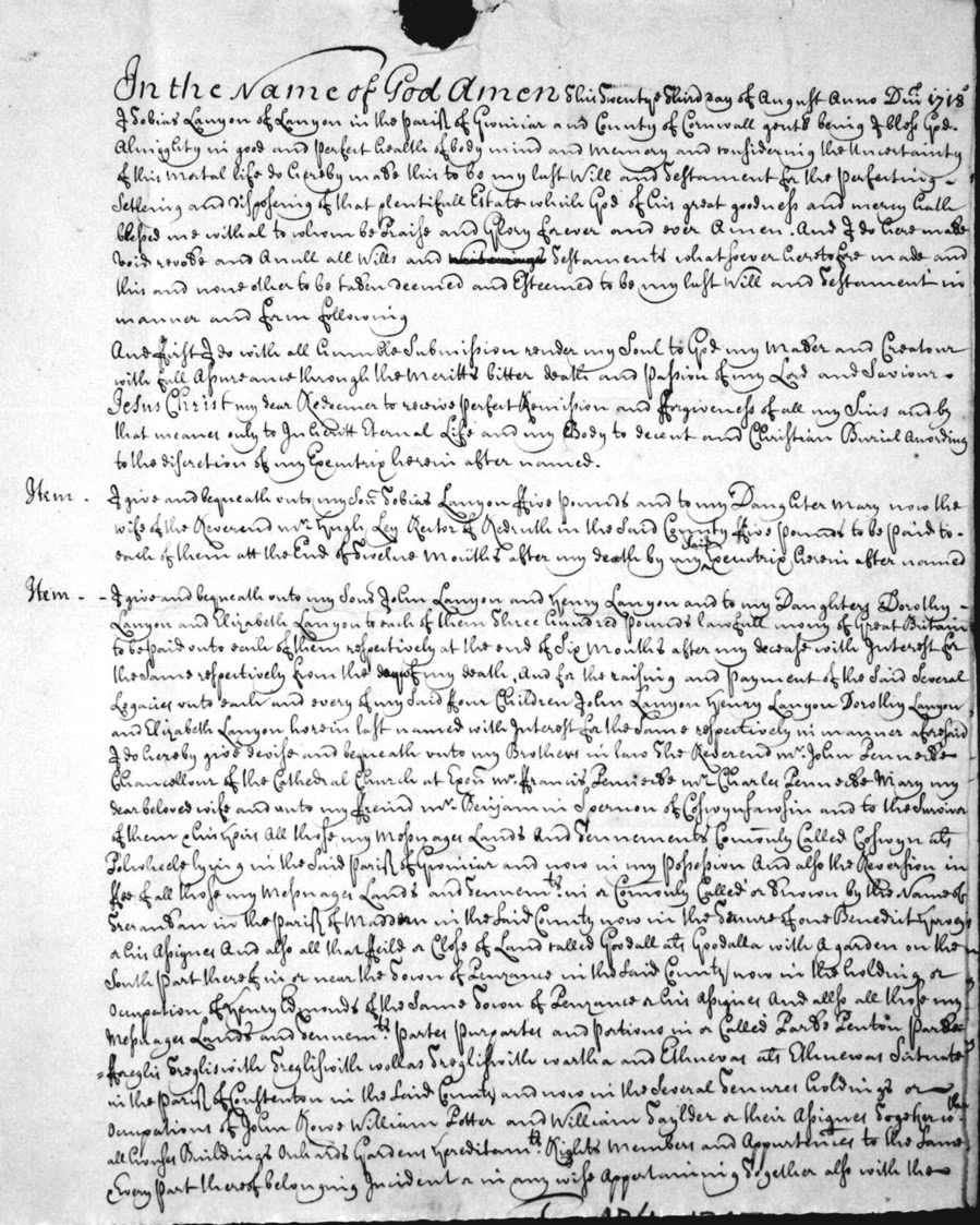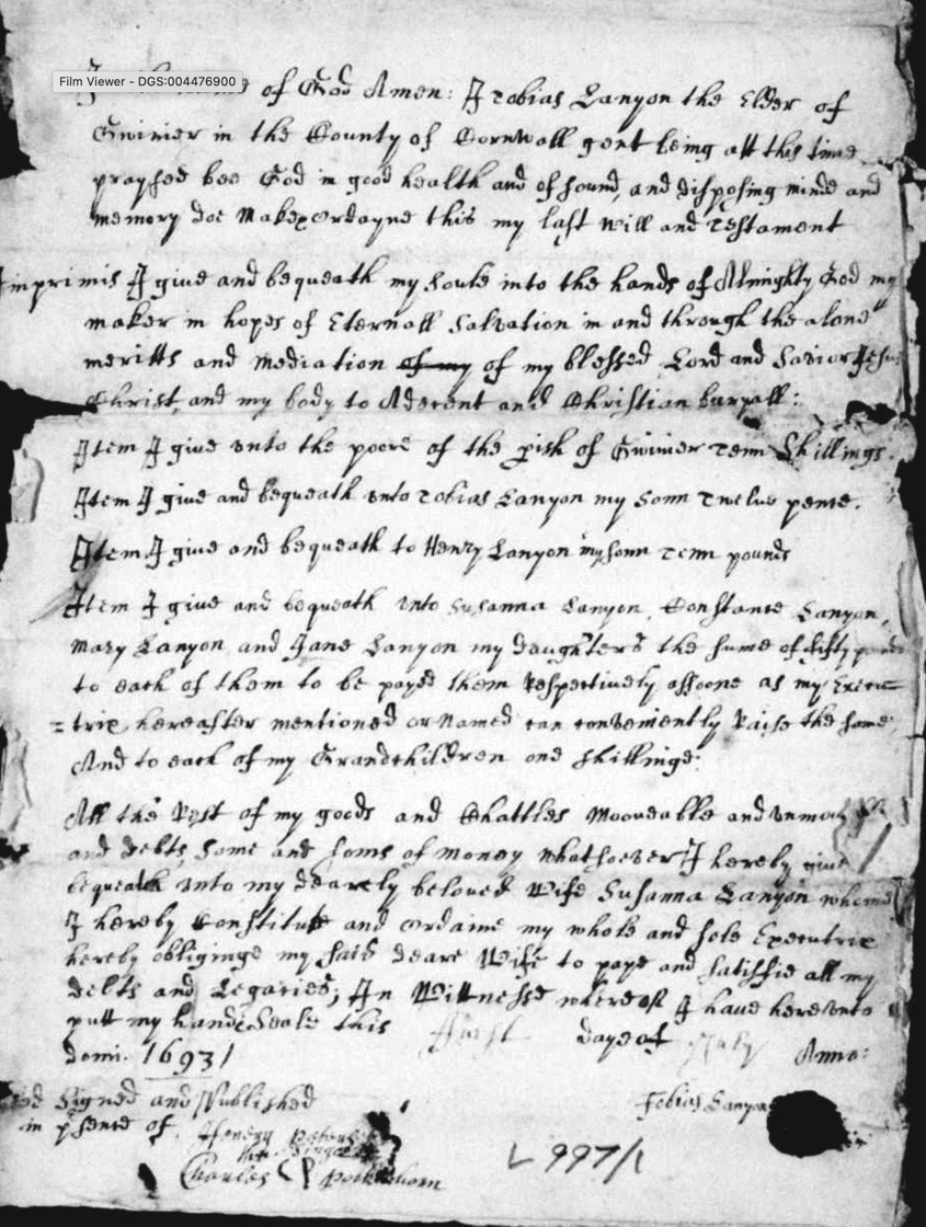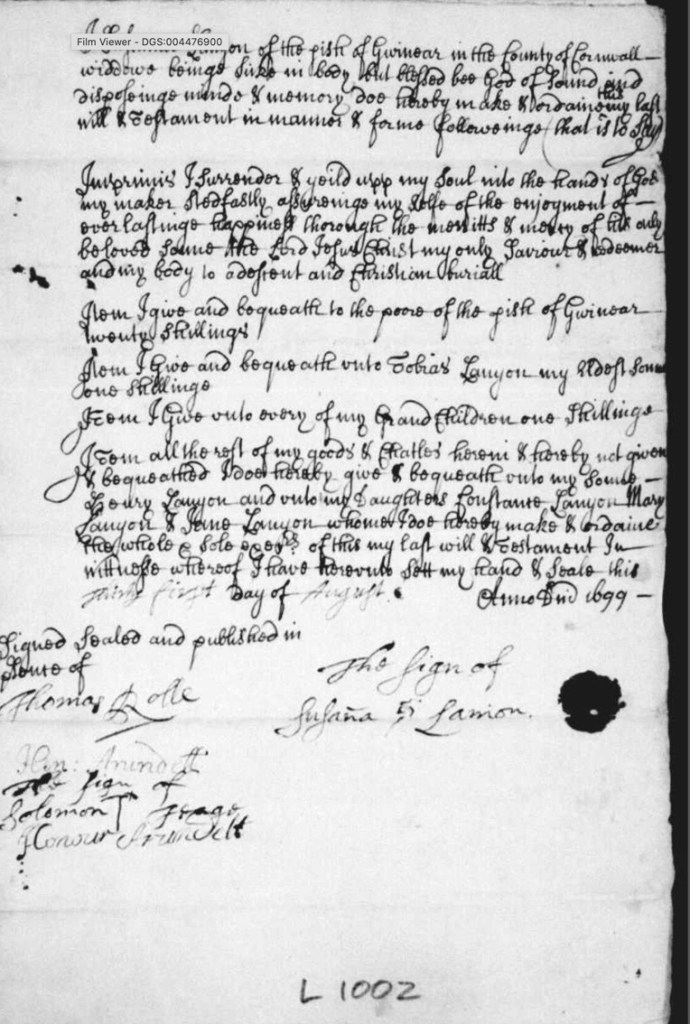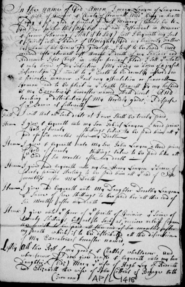 Will of Susannah Lanyon 1699 Source: AP/L/1002