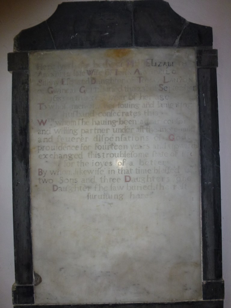 Elizabeth 1647-1683 married John Arundell Esq in 1669, they had six children. Elizabeth died age 36 and her husband erected a memorial plaque.