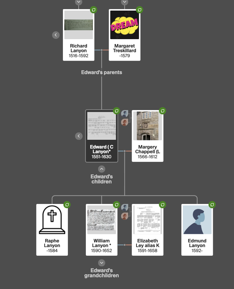 Edward was the 5th son of Richard Lanyon Esq and Margaret Treskillard. Norden’s ‘Survey of Cornwall’ 1584 mentions Edward Lanyon of Cuswyn Gwinear. We don’t know when he was born but it was probably late 1550’s early 1560’s, nor do we know when he married Margery Chappell, but their eldest surviving son was baptised in 1590.