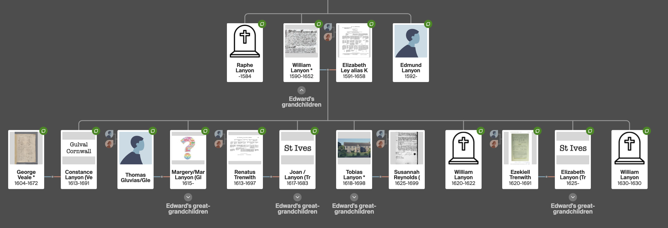 Joan/Johanna 1617-1663 married Renatus Trenwith at Gwinear in 1647, their son Thomas Trenwith married Rebecca Lanyon, the daughter of The ‘Golden’ Lanyon on the Botrea tree.