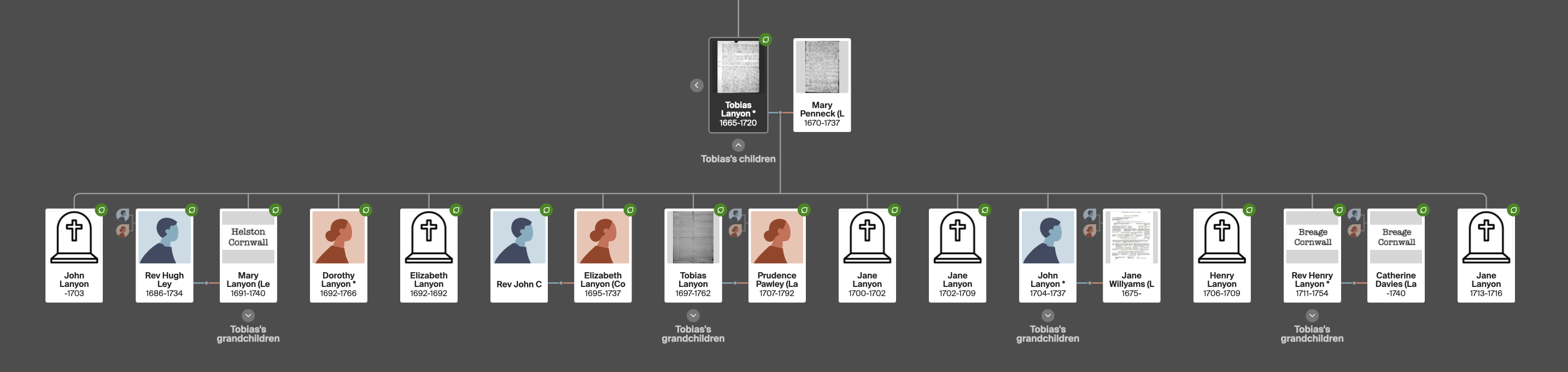 Assuming John was a similar age to Jane we are looking for a John born in the 1670s who lived at Lanyon Manor in Gwinear. This would probably be a child of Tobias Lanyon and Susannah Reynolds but they don’t have a child called John and don’t mention a son of that name in their wills. Tobias and Susannah’s son Tobias does have a son called John however he must have been born after 1703 and would be at least twenty-eight years younger than Jane Willyams!