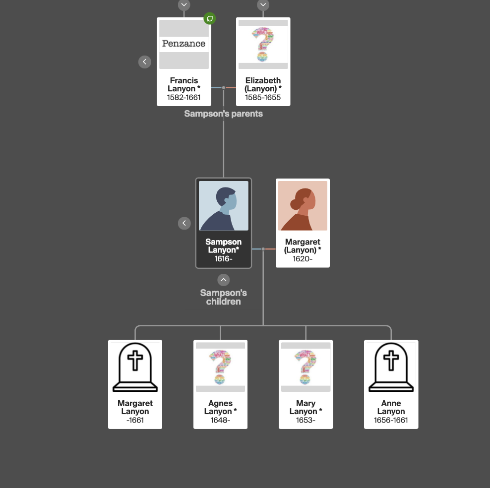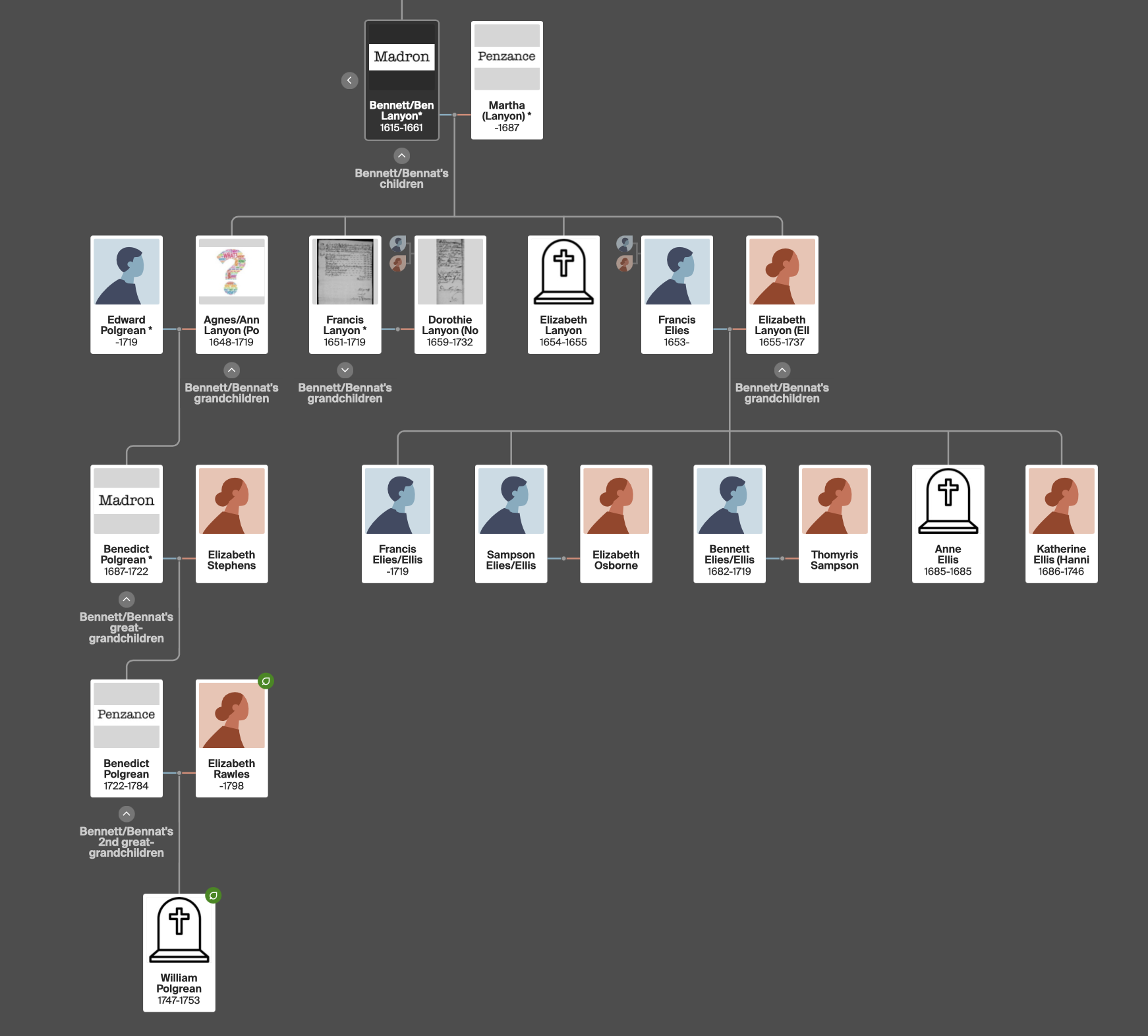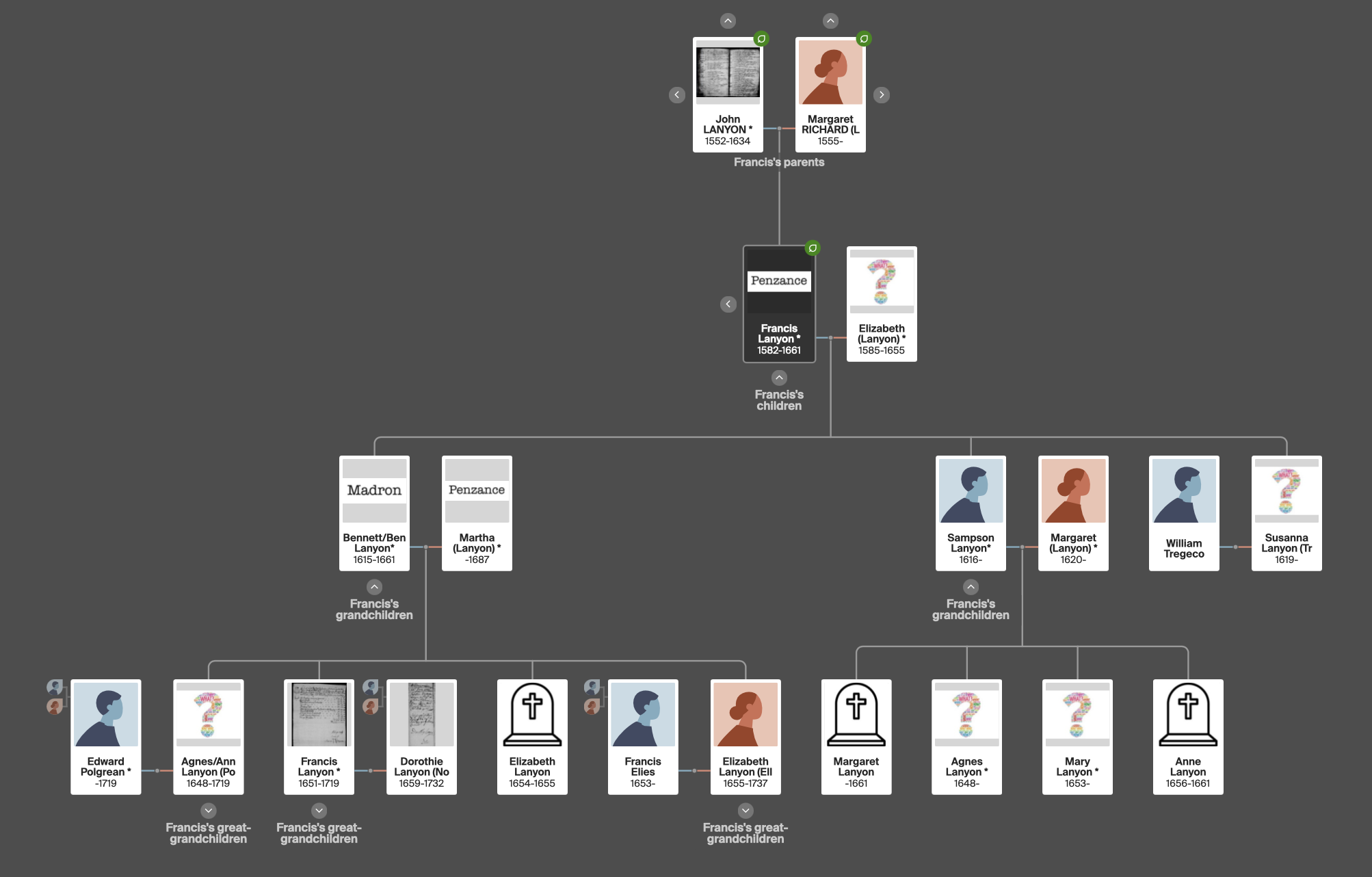 - Thomas -aft. 1633 mentioned in grandfather William Levelis’ will of 1633. In 1637 a Thomas Lanyon gent married Mary, possibly his marriage.